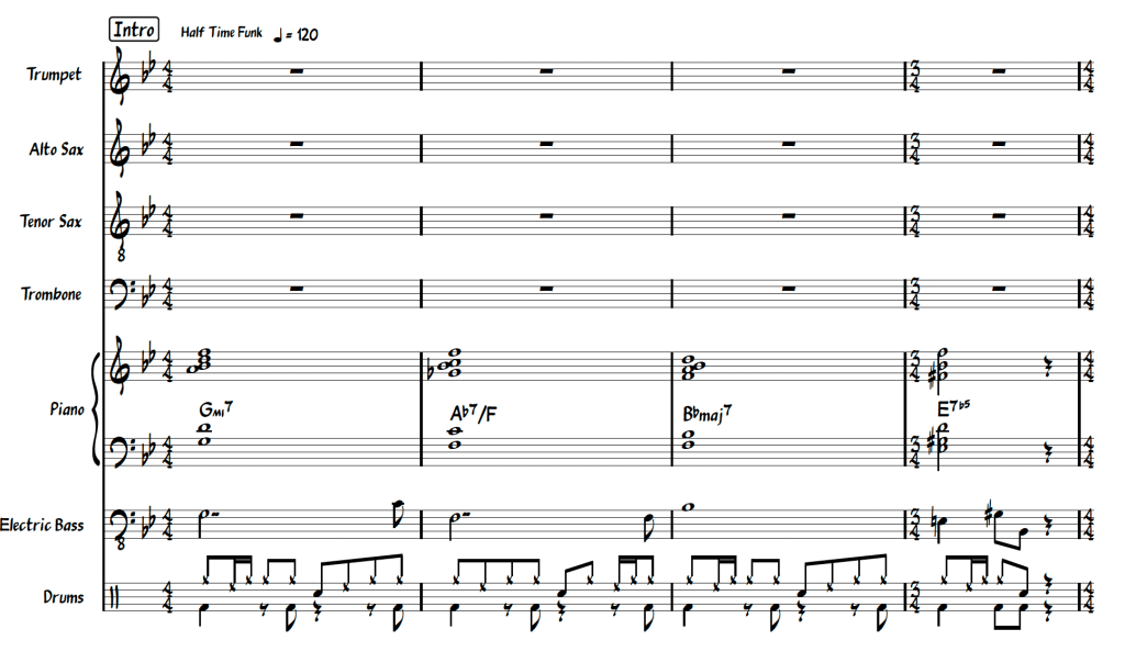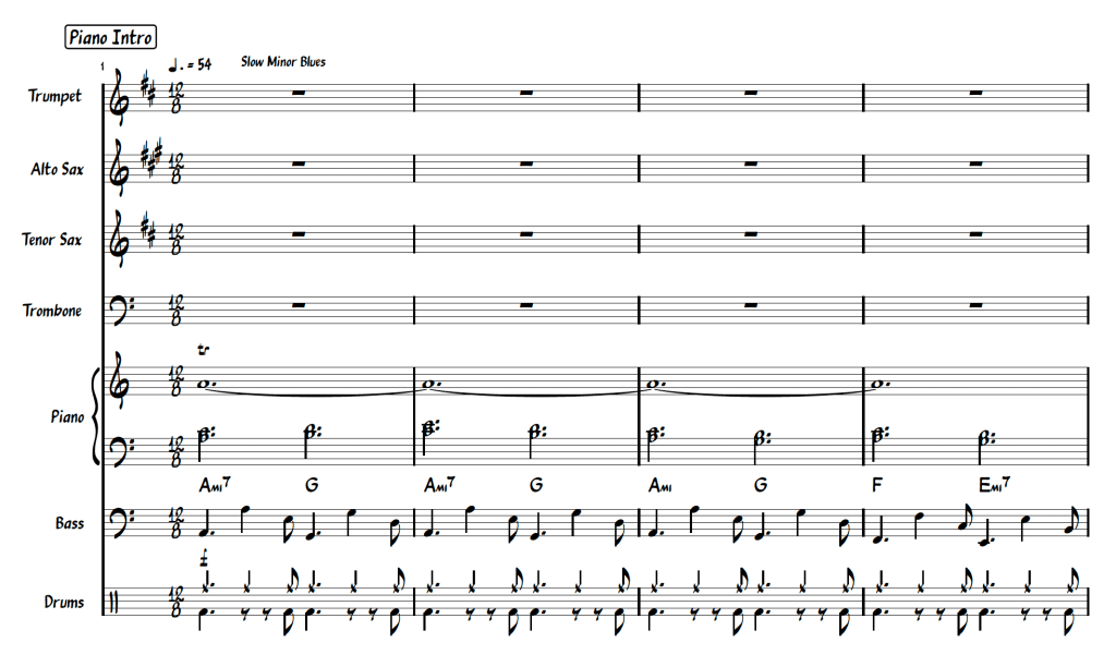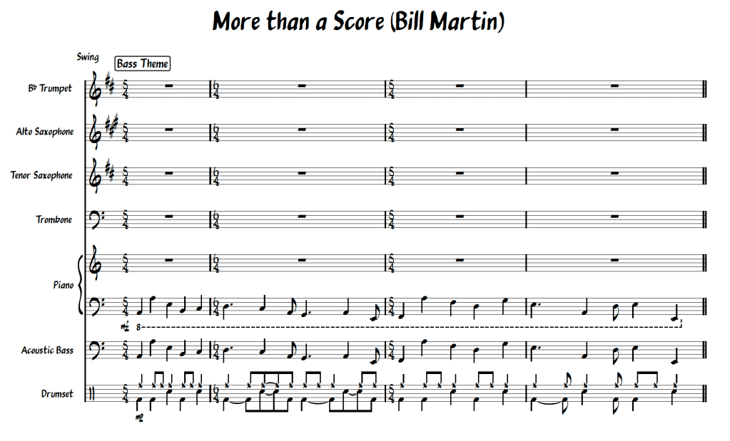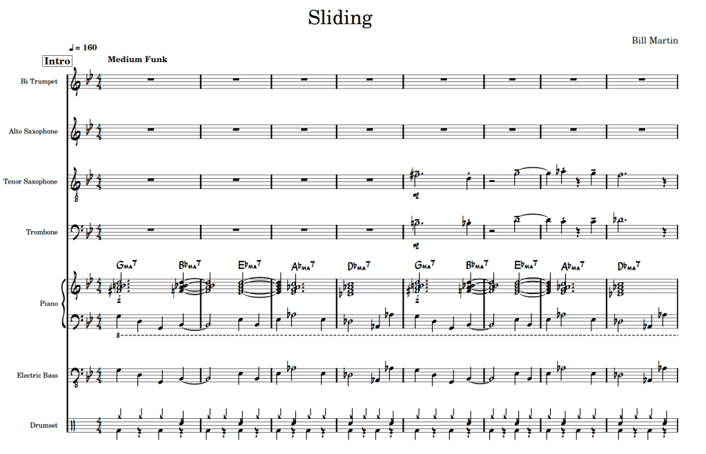 The small combo charts for the “Over to You” album, recorded live at the Dunedin Jazz Club, are available to purchase for NZ$60 each, or as a set of 6 for NZ$300. Each chart for septet comes with a score and individual parts for Trumpet, Alto, Tenor, Trombone, Piano, Bass and Drums. Images below are samples of the score. Links to the live recordings are also included below the samples.